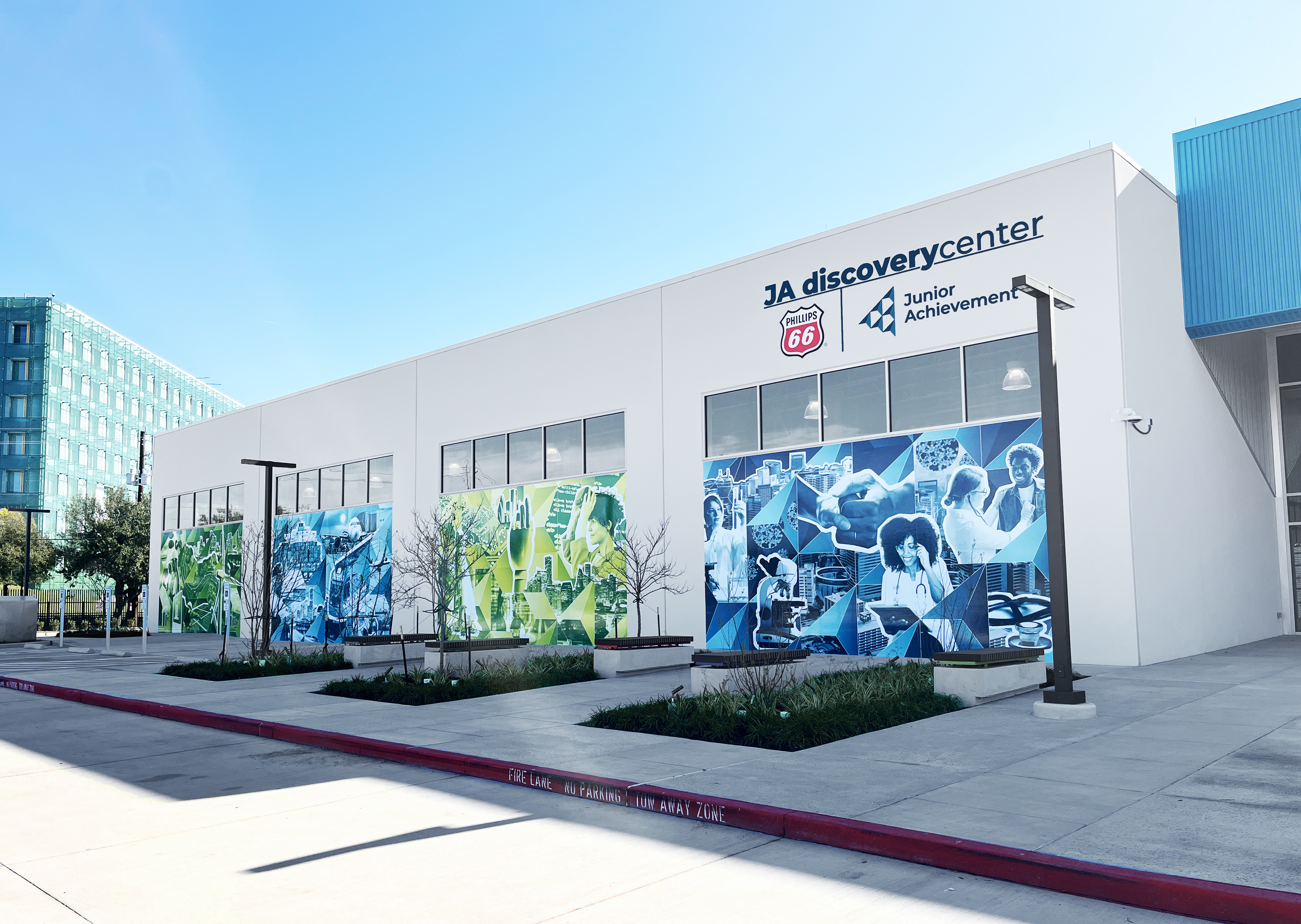 Each wall utilizes Junior Achievement’s brand and logo to focus on Houston’s four leading industries: the Medical Center, Emerging Technologies, Transportation, and Energy Transition.